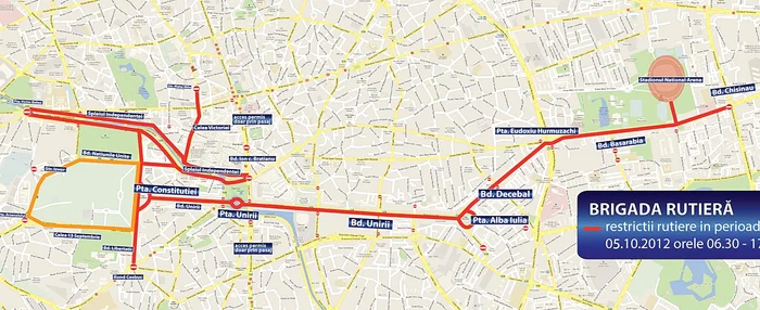 Ce-a de-a şaptea ediţie a Maratonului Internaţional Bucureşti va avea loc mâine în zona Pieţei Constituţiei. Circulaţia autovehiculelor va fi suspendată, azi şi duminică, de la ora 6.30 dimineaţa pentru desfăşurarea celor cinci probe ale competiţiei. Azi nu se va putea circula pe Bd. Unirii, în ambele sensuri, între Piaţa Constituţiei şi şi Bd. Regina Maria, până la ora 14.00. Mâine, restricţiile se extind fiindcă la ora 9.00 se dă startul probei de maraton (42 km). Nu se va putea circula între orele 6.30 – 17.00 pe traseul alergătorilor: Piaţa Constituţiei – Bd. Libertăţii – Bd. Unirii – Bd. Decebal – Bd. Basarabia (între Piaţa Hurmuzachi şi Bd. Chişinău) – zona Arenei Naţionale – Bd. Naţiunile Unite – str. Halelor – Splaiul Independenţei (între Pod Eroilor, Ştirbei Vodă şi Piaţa Unirii, ambele sensuri) - Calea Victoriei (între Splaiul Independenţei şi Biserica Kretzulescu).