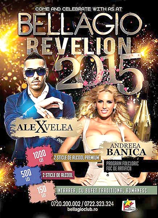 Dacă alegi să-ţi petreci Revelionul în Bellagio o vei întâlni pe sexoasa Andreea Bănică. Solista va face un show incendiar, urmată de finul ei, Alex Velea. Intrarea este în valoare de 150 lei, incluzând un bufet tradiţional, dulciuri şi fructe. Petrecerea va fi întreţinută şi de multe alte surprize speciale şi focuri de articificii. O masă rezervată te costă 500 de lei, ce include şi două băuturi alcoolice. În varianta VIP aveţi două băuturi alcoolice Premium, dar plătiţi 1.000 de lei.