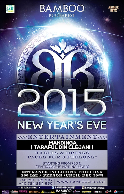 Pentru cei care preferă muzica de petrecere, Taraful din Clejani promite un chef de pomină în clubul de pe malul Lacului Floreasca din Capitală. Revelionul 2015 organizat în Club Bamboo aduce pe scenă şi trupa Mandinga. Preţul Revelionului este 200 lei şi include intrarea în club şi meniul de tip bufet suedez. Petrecerea începe la ora 19.00. Distracţie plăcută!