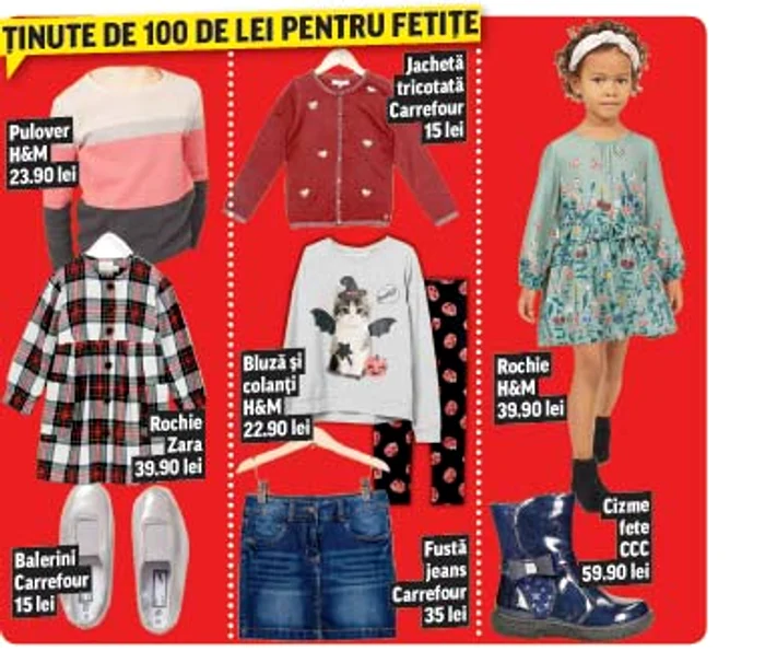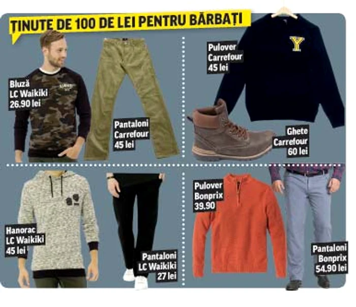 Noi am alcătuit pentru tine câteva ţinute care se încadrează în această sumă, dar tu poţi găsi în magazine mult mai multe lucruri pe toate gusturile şi pentru toate buzunarele.