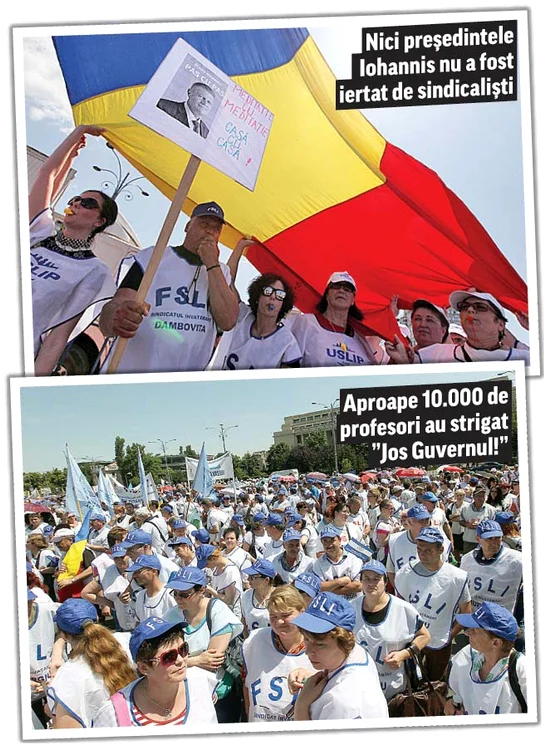 Au fluierat şi au huiduit, au suflat puternic în vuvuzele, au strigat din rărunchi. Au venit pe rând cu autobuzele, din toate colţurile ţării. Cei din Iaşi, Timişoara, Maramureş, Mehedinţi au plecat în toiul nopţii spre Capitală. Când au ajuns sub ferestrele Palatului Victoria, s-au trezit în infern: 28 de grade la umbră şi mii de maşini care treceau în goană pe lângă locul împrejmuit special pentru manifestanţi. “Jos Guvernul!”, “Demisia!”, ”Guvernul a decis: învăţământul va fi ucis”, au strigat cât au putut de tare sindicaliştii. Şi preşedintele Iohannis, fost profesor şi director de şcoală, a avut parte de atenţia protestatarilor: “Educationen Kaput!”, “Pas cu pas, către impas”, “Meditaţie cu meditaţie, casă cu casă”, scria pe pancartele aduse de foştii colegi de la Sibiu.