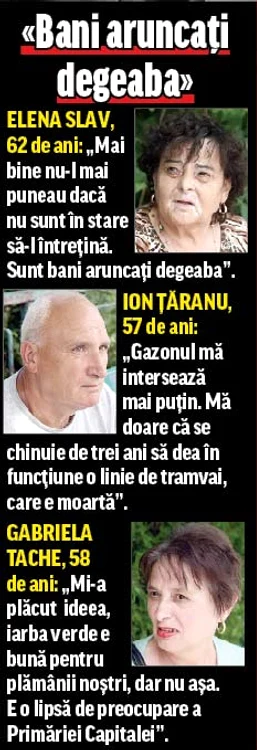 Ne place să copiem tot ce funcţionează în Vest, însă nouă nu ne iese ca la carte. Teoria e valabilă şi în cazul proiectului de realizare a primei linii de tramvai cu gazon din Capitală, pe strada Liviu Rebreanu din sectorul 3. Firmele angajate de Municipalitate să modernizeze sistemul rutier şi liniile de tramvai au plantat şi gazon între şine, în noiembrie 2013, pentru sporirea suprafeţelor înverzite din oraş. Iarba s-a ţinut tare până luna trecută, când a început să se ofilească, fără ca autorităţile să ia vreo măsură.