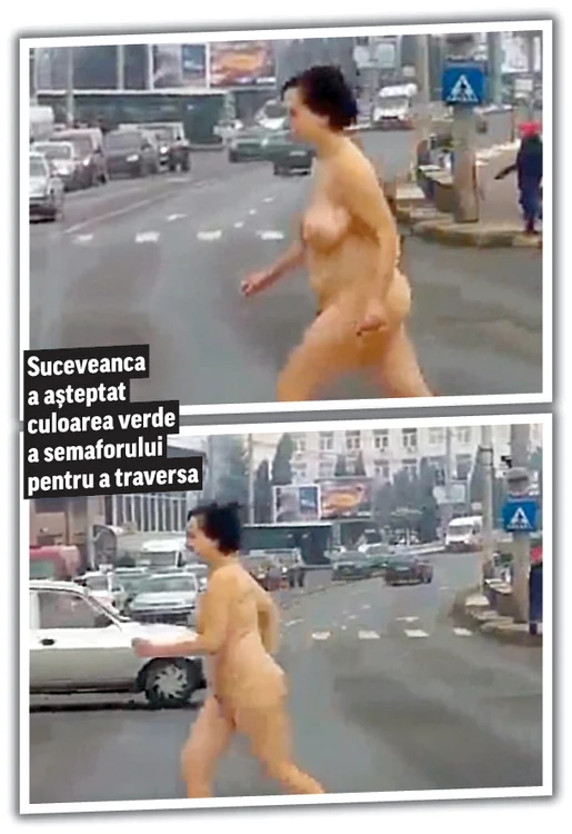 Un bărbat aflat într-o maşină care staţiona la semaforul din apropierea Primăriei Suceava a filmat-o pe femeie în timp ce aceasta se afla pe trotuar. Din imagini se observă că aceasta se clatină serios, iar apoi,când semaforul trece pe culoarea verde, traversează pe lângă o altă femeie care vorbea la telefon, dar care pare că nici nu o observă pe dezbrăcată.