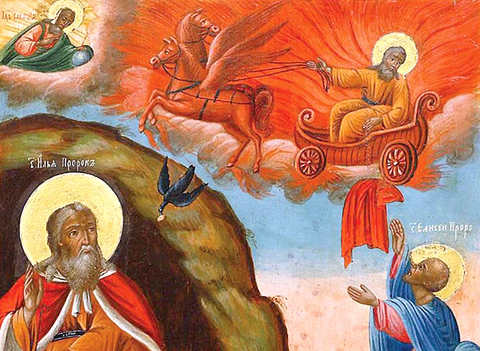 A fost ridicat la Ceruri şi de atunci cutreieră norii cu o căruţă cu roţi de foc, trasă de cai înaripaţi şi trăsneşte dracii cu un bici de foc.
