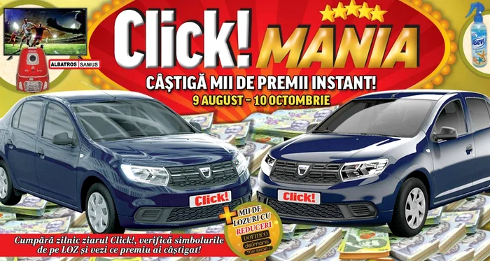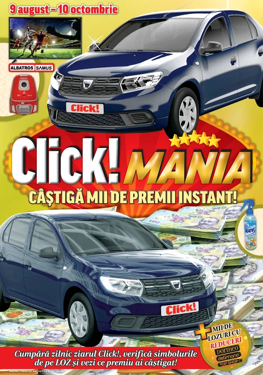 Începând de vineri, 9 august, cumpără zilnic ziarul ”Click!”, verifică lozul de concurs de pe prima pagină și poți câștiga unul dintre cele peste 5000 de premii puse în joc.