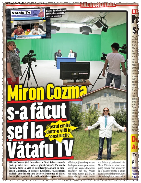 ”Vătafu TV” a funcţionat doar o lună şi doar pe Internet, într-o vilă în construcţie din Popeşti Leordeni, Ilfov. Închis de autorităţi, a fost redeschis recent, dar „echipa” se împarte între munca de tv şi munca la benzinărie. Când nu alimentează sau încasează bani, Cozma are grijă de animalele din curtea televiziunii. „Nu am uitat de mascotele televiziunii, am grijă de ele. Le dau să mănânce, apă. Nu vă zic că, după ce aţi scris de curcanul lui Miron în ziarul Click!, m-am trezit cu o sumedenie de copii să-şi facă poze cu mine”, ne-a spus amuzat Miron Cozma, al cărui vis este să-şi vadă televiziunea pe cablu.