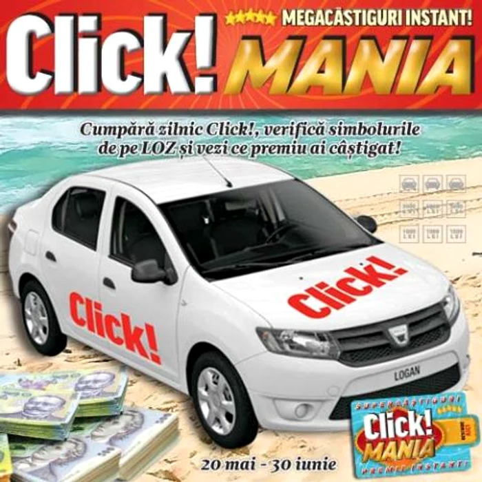 În perioada 20 mai – 30 iunie 2016, în fiecare zi, de luni până duminică, pe ziarele ”Click!” și ”Click! de DUMINICĂ” găseşti lipit câte un loz Click!MANIA pentru participarea la concurs.