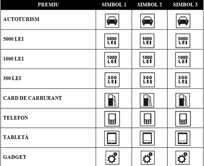 Exemple: pentru a câștiga premiul constând în mașină, pe loz trebuie să apară 3 simboluri cu mașină. Pentru a câștiga suma de 5.000 de lei, pe loz trebuie să apară de 3 ori simbolul 5.000 LEI.