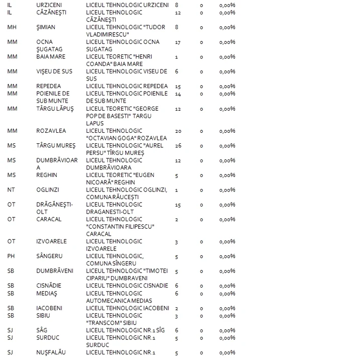 În 54 de licee din țară nici un elev nu a reușit la examenul de Bac 2015, iar promovabilitatea a fost 0%. Multe din acestea sunt în localități mici, dar printre acestea se află și câteva din municipii. Judeţul Maramureş este fruntaş la acest capitol, cu şapte unităţi de învăţământ unde elevii au picat pe linie examenul de Bac 2015. În judeţul Sibiu sunt cinci şcoli unde Bac-ul a fost un eşec total.