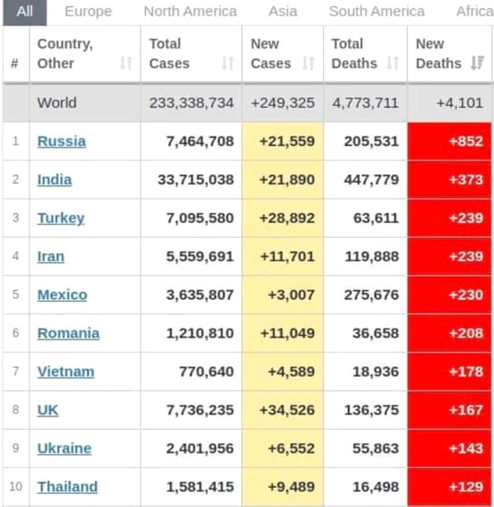 România este pe locul 6 în lume și pe locul 2 în Europa la decesele înregistrate în ultimele 24 de ore, a anunțat marți seara Comitetul Național de Coordonare a Activităților privind Vaccinarea împotriva COVID-19 (CNCAV).