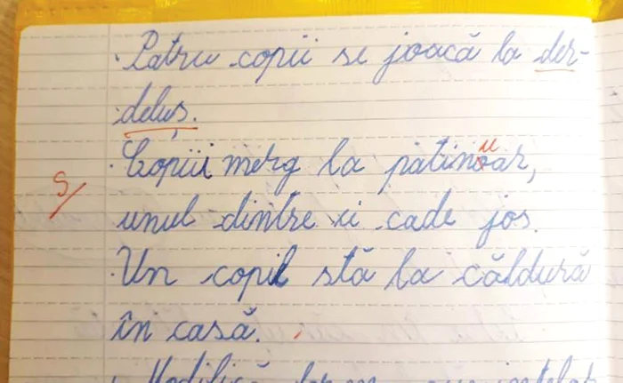 Părinte revoltat! Tatăl unui elev din clasa a II-a de la Colegiul „Mihai Eminescu” din Iaşi a postat luni, pe pagina sa de Facebook, o parte din lucrarea fiului său, în care învăţătorul îi modifică cuvântul „patinoar”, în „patinUar”, susţinând că ultima formă este cea corectă.