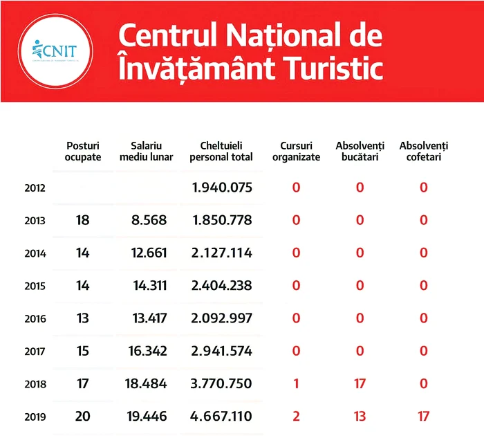 „Compania există de mulţi ani şi ar trebui, în teorie, să se ocupe de cursuri pentru specializarea personalului din turism. În realitate, din 2012 au organizat un total de 3 cursuri şi au format un număr de 47 de persoane. Din 2012. Compania a avut 20 de posturi în 2019, majoritatea de conducere sau administrative. Salariul mediu din companie e de aproximativ 19.500 lei pe lună. Dacă ne uităm la cheltuielile de personal per individ format, suma a fost de 155.570 lei în 2019. O sumă colosală. Am trimis Corpul de Control acolo. Este inacceptabil”, a adăugat Năsui.