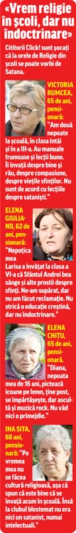 “Sunt trei cazuri cunoscute în Bucureşti, la liceele Xenopol, Vianu şi Şcoala Centrală. Inspectoratul Şcolar nu poate accepta astfel de derapaje şi experienţe pe copii. Joi (astăzi - n.r.) va fi o întâlnire de urgenţă cu toţi profesorii de Religie din Bucureşti. Va fi prezent şi un reprezentant al Patriarhiei, singura instituţie care poate interzice preoţilor astfel de practici. Inspectoratul Şcolar va cere ca profesorii să se limiteze la lecţiile din manuale, să pună mâna pe cărţile de pedagogie şi psihologie. Fiecare profesor are dreptul la propriile opinii, dar la el acasă”, ne-a explicat Marian Banu, de la Inspectoratul Şcolar Bucureşti.