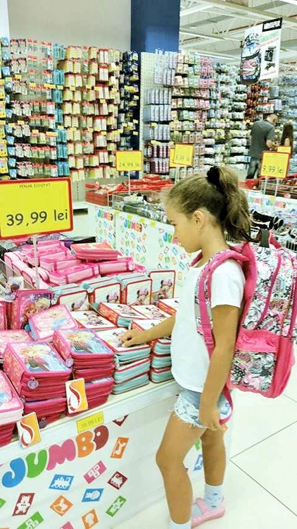”Am stat ore în şir la cumpărături, prin mai multe magazine. Maria merge în clasa întâi şi a vrut ca în prima zi de şcoală să aibă hăinuţe şi lucruşoare noi. A ales un rucsac Barbie roz, o cutie pentru sandvişuri tot roz, penar de fete roz, creioane, caiete. Până şi bidonaşul de apă este roz, cu personajul din filmul de desene animate Frozen. I-am luat şi o mulţime de agrafe de păr, pentru că este foarte cochetă, plus trening, pantofiori, tricouri şi alte lucruri necesare. La sfârşitul zilei s-a declarat foarte mulţumită şi mi-a spus că şcoala poate să înceapă, pentru că ea este gata”, ne-a povestit Gabriela Rovenţa, mama şcolăriţei Maria, în vârstă de aproape 7 ani, din Capitală.