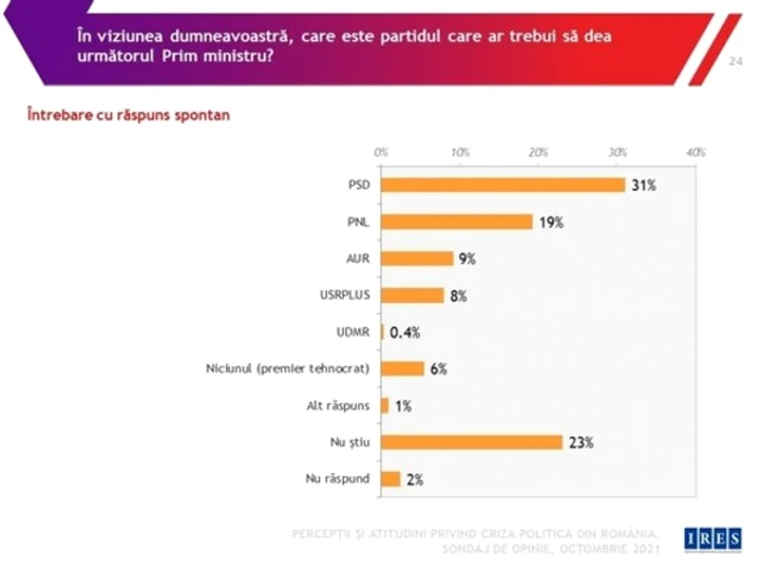 Cât despre partidul care ar trebui să dea viitorul prim-ministru, pe primul loc se află PSD, cu 31%, urmat de PNL, cu 19%. AUR (9%) devansează USR (8%), iar 6% susţin varianta premierului tehnocrat. “Nucleul dur al PSD este în acest moment de 31%. La acest procent se adaugă si votanţii conjuncturali”, spune Vasile Dîncu, preşedintele Consiliului Naţional al PSD.Sondajul a fost realizat pe un eşantion simplu, aleatoriu, de 994 de repondenţi de peste 18 ani, în perioada 6-7 octombrie, prin metoda CATI, eroarea maximă tolerată fiind +/-3,1%.