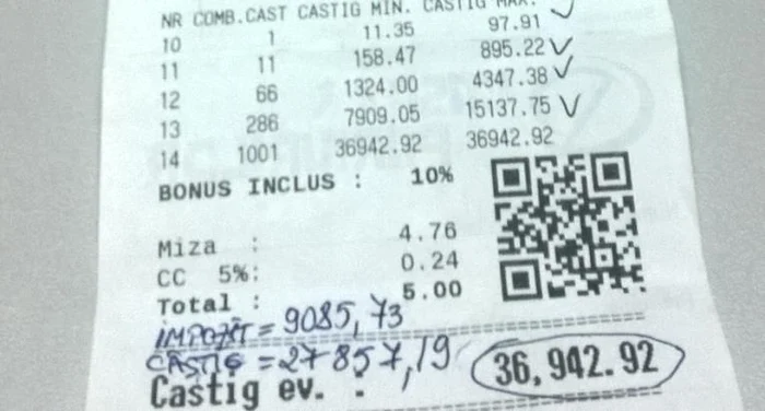 Constantinescu Marinică, în vârstă de 39 de ani, a jucat un bilet combinat la pariuri sportive într-o agenție Casa Pariurilor din Bacău, alegând cu multă pricepere 14 evenimente la fotbal. Toate previziunile lui s-au dovedit mai mult decât inspirate, aducându-i un câștig de 36 942 lei!