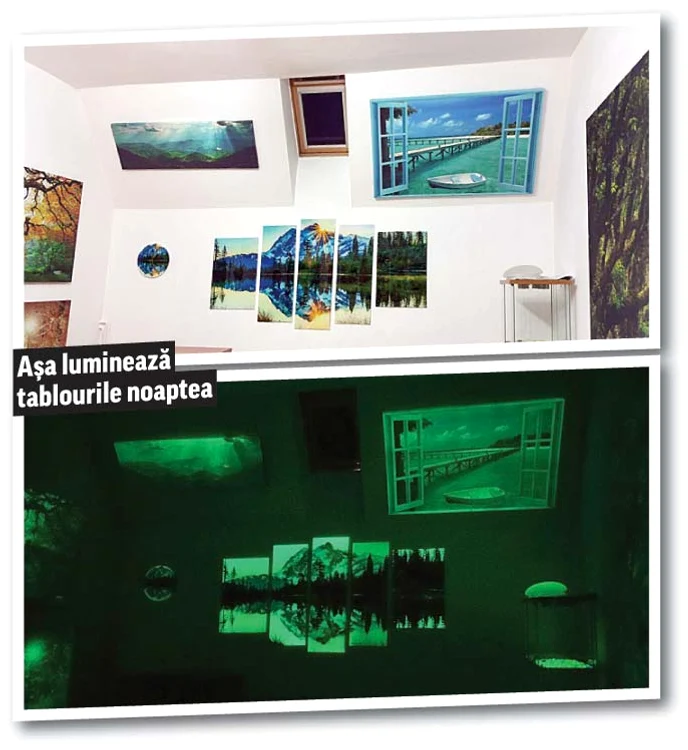 Cine ar fi crezut că o afacere cu tablouri care luminează pe întuneric ar avea succes? Ei bine iată o idee inovatoare care a adus deja o grămadă de bani unui tânăr din Râşnov, judeţul Braşov. “Tablourile se încarcă la lumina soarelui pentru doar câteva minute, după care luminează toată noaptea”, îşi începe povestirea Emil Grecu, patronul fabricii. Dar ca să ajungă în casele oamenilor, tablourile trec printr-un adevărat proces de producţie, care începe în camera de printat. Aici totul e simplu şi fără secrete. În schimb, la pasul următor intervine “magia”.