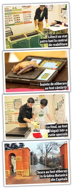 Aici, medicul veterinar Ovidiu Roşu, biologul Dragoş Mantoiu şi peste 100 de voluntari i-au tratat şi hrănit, iar acum i-au pregătit pentru a fi eliberaţi în natură. Zburătoarele au fost mai întâi cântărite pentru a vedea dacă greutatea lor e optimă (trebuie să aibă între 20 şi 30 de grame), apoi hrănite cu viermişori de făină şi la final puse în cutii speciale, care îşi vor găsi locul pe arborii bătrâni din Grădina Botanică. Ele vor fi monitorizate cu ajutorul unui inel pe care îl au legat de aripă. “Sunt animale sensibile cu care putem coabita. Au nevoie de ajutorul nostru! Ei nu fac rău în mod voit. Sunt docili şi nu au de ce să fie consideraţi un element înspăimântător. Fără ei, în 10 ani nu am mai avea agricultură în România. Am ales Grădina Botanică, pentru că e un loc sigur, păzit, e un mediu propice pentru ei. Se vor bucura de o casă special amenajată pentru ei, iar după apus, zborul lor va fi înregistrat, cu ajutorul unei camere cu infraroşu”, ne-a declarat biologul Dragoş Mantoiu. Tot el spune că 1.000 de lilieci pot mânca 25 kg de insecte într-o seară. La vară, înaripatele vor devora numeroase insecte, precum ţânţari sau cărăbuşi.