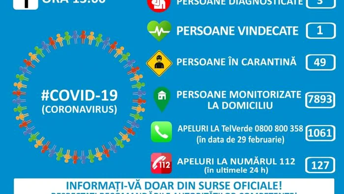 Dintre cele trei persoane depistate pozitiv cu virusul COVID-19 pe teritoriul României, doar doi pacienți mai sunt purtători ai virusului, a informat Grupul de Comunicare Strategică. 49 de persoane sunt în carantină și 7.893 în izolare la domiciliu, la nivel național, la data de 1 martie, ora 13:00, potrivit comunicatului anterior menționat.