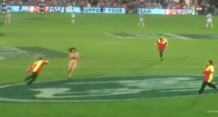Femeia a intrat goală pe teren, a început să alerge şi se pare că l-a şi plesnit pe Israel Dagg, unul dintre jucătorii Noii Zeelande.