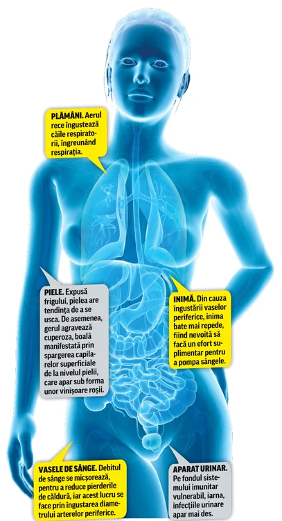 Temperaturile scăzute suprasolicită corpul, care trebuie să se adapteze frigului pentru a funcţiona normal. Asta după ce a fost obişnuit cu zile „plăcute”, temperaturi pozitive şi presiune normală. Medicii atrag atenţia că schimbarea bruscă a vremii, dar şi variaţiile de presiune atmosferică i-ar putea afecta serios pe cardiaci şi pe astmatici. Bolnavii cronici, îndeosebi cardiacii, astmaticii şi cei care suferă de reumatism, trebuie să fie foarte precauţi în aceste zile.