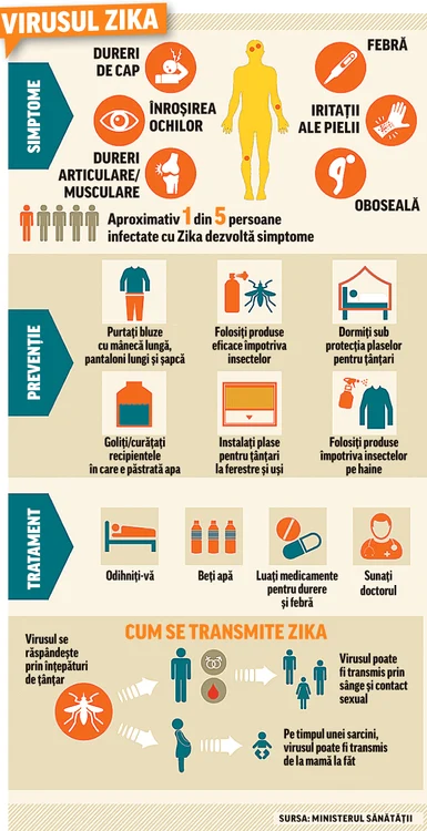 Virusul Zika este transmis de înţepătura ţânţarului-tigru Aedes Aegypti, insectă care trăieşte în zone tropicale sau aride. Până în acest moment, prezenţa lui nu a fost semnalată în ţara noastră, însă ţânţarul-tigru african are un frate mai puţin agresiv, cu largă răspândire în România, ţânţarul-tigru asiatic Aedes albopictus. În ciuda răspândirii sale, nu s-a dovedit până acum că Aedes albopictus transmite pe cale naturală acest virus, în afara continentului african (conform Institutului Cantacuzino). Prin urmare, atâta vreme cât această specie nu se află încă pe teritoriul ţării noastre, nu există motive pentru care să te temi de Zika. De altfel, chiar dacă eşti virusat, nu ai prea multe motive de panică. Virusul Zika nu dezvoltă boli grave, ci se manifestă ca o gripă normală, cu febră, erupţii cutanate, dureri de cap şi musculare, poate şi conjunctivită. Însă toate aceste simptome dispar în 2-7 zile. Nu există un tratament specific pentru Zika. Medicii recomandă aceleaşi metode ca în cazul răcelilor sau gripei. Persoanele infectate trebuie să se odihnească, să se hidrateze corespunzător şi să apeleze la medicamente împotriva febrei.