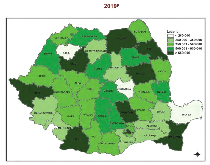 Distribuţia emigranţilor în profil teritorial arată existenţa unor „bazine de emigrare“, în special în judeţele unde populaţia este foarte numeroasă. Astfel, dacă în 2014 emigrau anual peste 6.500 de persoane doar din judeţele Iaşi, Prahova, Constanţa şi Bucureşti, în anul 2018 emigraţia intensivă s-a extins şi la judeţele Timiş, Bihor, Cluj, Mureş, Dolj, Argeş, Suceava şi Bacău. Îngrijorător este faptul că vârsta dominantă a emigranţilor este situată în intervalul 25-29 ani.Deşi populaţia rezidentă a României urmează o tendinţă descendentă, România încă se regăseşte în topul statelor membre ale Uniunii Europene, clasificate după dimensiunea populaţiei, ocupând poziţia a şaptea, cu o populaţie de 19,4 milioane locuitori. Cu toate acestea, lucrurile se vor schimba radical, arată cele mai recente proiecţii demografice realizate de institutul european de statistică Eurostat la nivelul UE. În anul 2018, primele şapte ţări după mărimea populaţiei au fost Germania, Franţa, Regatul Unit, Italia, Spania, Polonia şi România. Însă conform proiecţiei demografice realizate de Eurostat la orizontul anului 2100, România va coborî două locuri în clasament, plasându-se pe locul al nouălea, fiind devansată de Olanda şi Suedia. Populaţia prognozată a României va fi de 13,3 milioane locuitori, în scădere cu aproximativ 6,2 milioane persoane faţă de anul 2018. Pe primele trei locuri se vor afla în continuare Regatul Unit cu o populaţie prognozată pentru anul 2100 la 84,7 milioane locuitori, pe locul al doilea se va afla Germania cu o populaţie estimată la 79,1 milioane locuitori, iar Franţa se va plasa pe cel de al treilea loc cu 72,9 milioane persoane.
