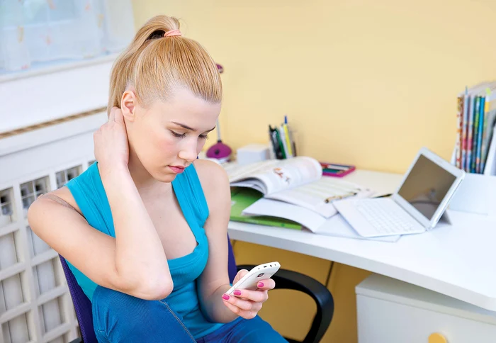 Dacă stai aplecat prea mult asupra ecranului telefonului, musculatura gâtului are de suferitFoto: Shutterstock