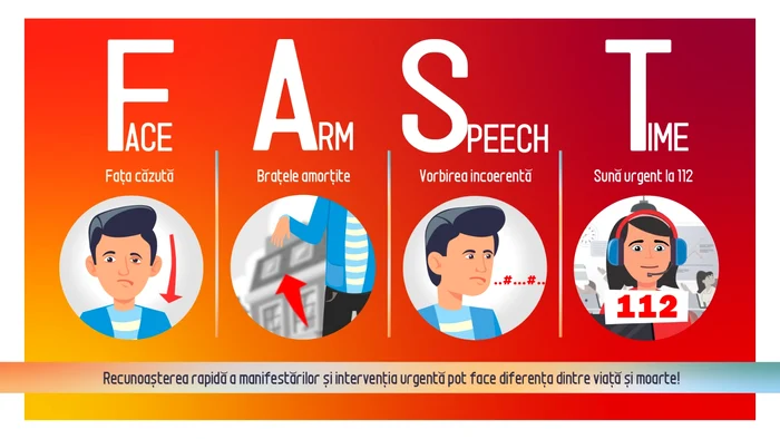 FAST este un acronim format din primele litere ale celor mai importante simptome ale unui AVC: F este de la Față căzută și asimetrică, A de la Amorțirea brațelor și picioarelor, S de la Stâlcirea sau Sacadarea vorbirii, iar T vine de la Timp, pentru că atunci când un aparținător sesizează simptomele, este timpul să sune urgent la 112. “Atenția fiecăruia dintre noi la cei din jur și reacția imediată în caz de pericol nu trebuie să țină cont de timpuri sau de temeri, pentru că, așa cum obișnuim noi, medicii din domeniul neurologiei și neurochirurgiei, să spunem: Timpul este creier!”, declara dr. Lucian Mărginean, medic coordonator compartiment neuro radiologie intervențională în cadrul Spitalului Clinic Județean de Urgență Târgu Mureș.