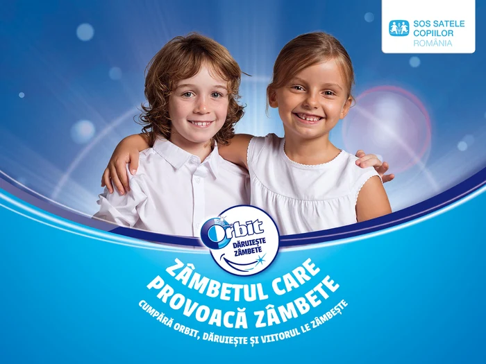 Campanie Orbit mai are însă și un alt țel: acela de a-i ajuta pe cei mai mici să zâmbească și să aibă încredere în ei! Orbit „Dăruiește zâmbete” și-a propus ca 1% din valoarea fiecărui pachet de gumă Orbit vândut în perioada 8 octombrie – 30 noiembrie să fie redirecționată către SOS Satele Copiilor România.