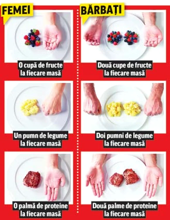 Bărbaţii au nevoie să mănânce două bucăţi de carne la grătar care să fie de dimensiunile palmei (n.r. se calculează palma, până la baza degetelor). Femeile doar o bucată. La capitolul garnitură, bărbaţii au voie să mănânce doi pumni strânşi de legume fierte, pilaf, varză călită etc, iar femeile doar un pumn. În felul acesta, veţi şti cu siguranţă că nu mâncaţi mai mult de 750 de calorii la o masă. Trebuie menţionat că necesarul zilnic de calorii pentru un bărbat este de 2.500 de calorii, iar pentru o femeie de 2.000 de calorii. Pentru a calcula necesarul de cereale, folosiţi mâinile făcute cupă: cât intră într-o cupă este o porţie zilnică. La bărbaţi, sunt necesare două cupe pentru a asigura nevoia zilnică de carbohidraţi, la femei, una singură. Când vine vorba de alimente bogate în grăsimi, ca margarină, unt sau nuci, arahide sau alune, e nevoie să folosiţi degetul mare, integral. Bărbaţii au voie să mănânce „două degete mari” de alune sau două cuburi de brânză de aceste dimensiuni, iar femeile, un singur deget.