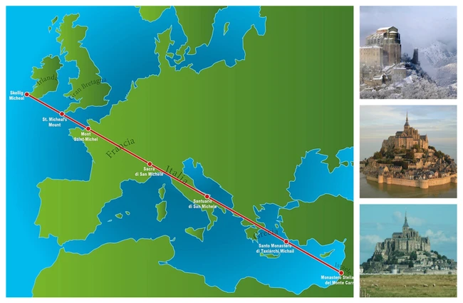 Liniei imaginare i se spune Via Sancti Michaelis. Printre mănăstirile perfect aliniate pe această direcție se numără și cele mai importante trei mănăstiri medievale din Europa care îl venerează pe Sfântul Mihail: Mont Saint-Michel din Normandia din Franța, Sacra di San Michele din Piemont, Italia și Monte Sant’Angelo (Monte Gargano) din Apulia, Italia, arată catholicworldreport.com.