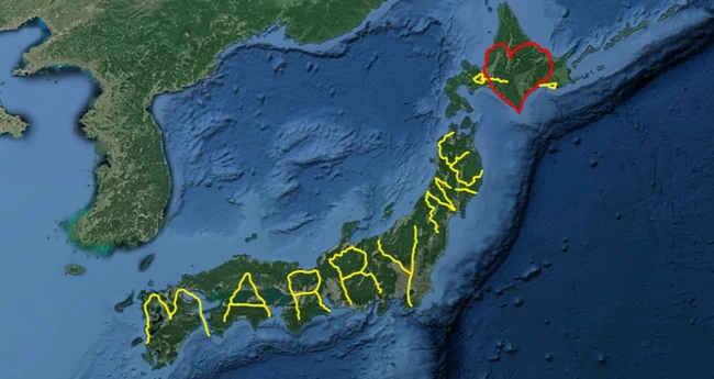 În anul 2008, Yasushi „Yassan” Takahashi, un bărbat din Tokyo, și-a cerut partenera, după 11 ani de relație, în căsătorie, folosindu-se de Google Earth și un dispozitiv GPS. El și-a dat demisia de la locul de muncă pentru a putea pune în aplicare planul său. Timp de jumătate de an, 6 luni, Takahashi a călătorit de-a lungul Japoniei pentru a scrie mesajul „Marry me”. Mai mult decât atât, bărbatul a „desenat” și o inimă.