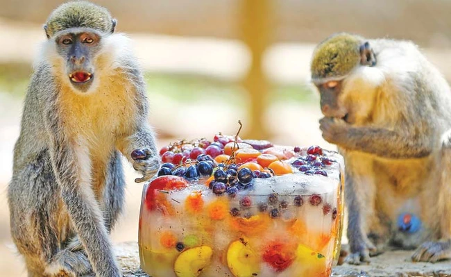 Maimuţele au primit fructe congelate ca să se răcorească. Bucuroase foc, primatele s-au pus pe joacă după ce s-au ospătat. Maimuţele trăiesc în Asia, Africa şi America de Sud. Chiar dacă în mare parte sunt originare din zone cu climă caldă, suportă cu greu temperaturile prea mari în lipsa unei păduri.