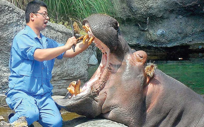 Tetsuo, un hipopotam de 14 anişori, e cam certat cu dentistul. De când a devenit „locatar” al grădinii zoologice Tennoji din Osaka, Japonia, uriaşul a avut o igienă orală foarte precară.