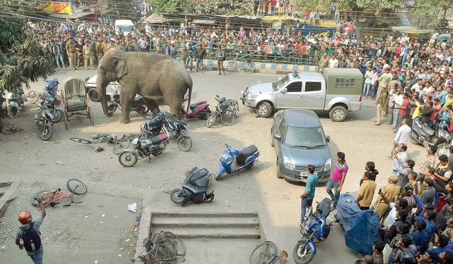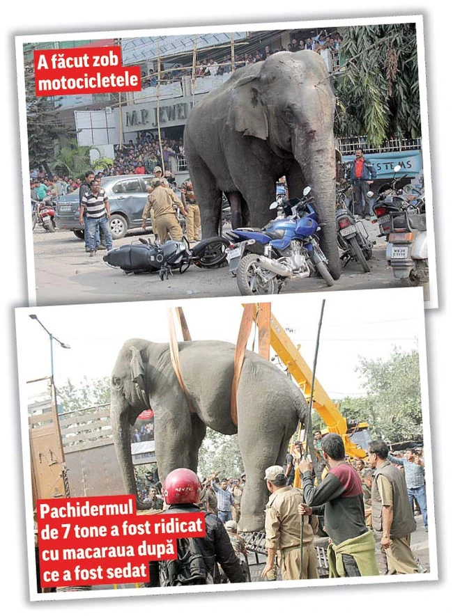 Alerga ca nebunul pe străzi, zdrobind motociclete şi alte vehicule. În cele din urmă, echipele de salvare au reuşit să-l sedeze cu săgeţi tranchilizante. Pachidermul a fost ridicat cu o macara şi dus în pădurea Sukna. Experţii spun că distrugerea habitatului natural al elefanţilor îi determină pe aceştia să dea raite în zonele locuite.