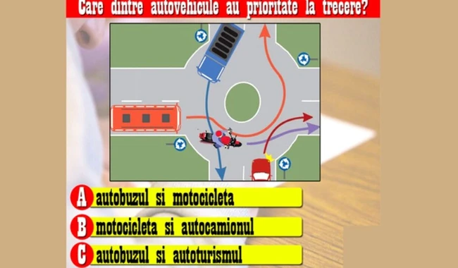 Click îți oferă un exemplu de întrebare dintr-un test auto care pune în dificultate chiar și șoferii cu experiență: Cine are prioritate într-o intersecție cu sens giratoriu?