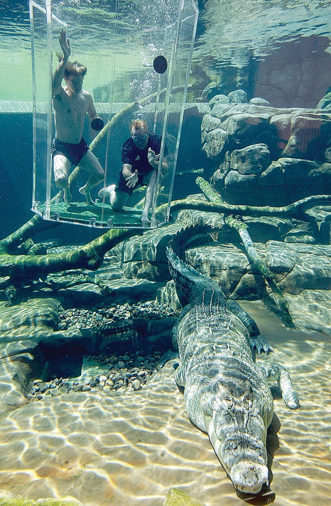 De dimineaţă, de la ora 10 şi până la asfinţitul soarelui parcul de distracţii din Australia este arhiplin. Anual peste 1,7 milioane de turişti îi trec pragul pentru a hrăni crocodili şi pentru a se plimba nestingheriţi deasupra imenselor reptile care pândesc viclean din apă. Cei mai îndrăzneţi nu se uită la bani atunci când vine vorba de adrenalină şi senzaţii tari. Intră în bazinul adânc de patru metri al lui Chopper, crocodilul de 88 de ani, şi petrec într-un „borcan” din sticlă securizată timp de aproape 20 de minute „cele mai intense momente din viaţa lor”. Cine vrea se poate poza cu gigantul care se uită pofticios la vietatea neajutorată protejată doar de un geam firav. Parcul care se întinde pe 5.000 de metri pătraţi a fost premiat în 2010 pentru originalitate şi concepţie.