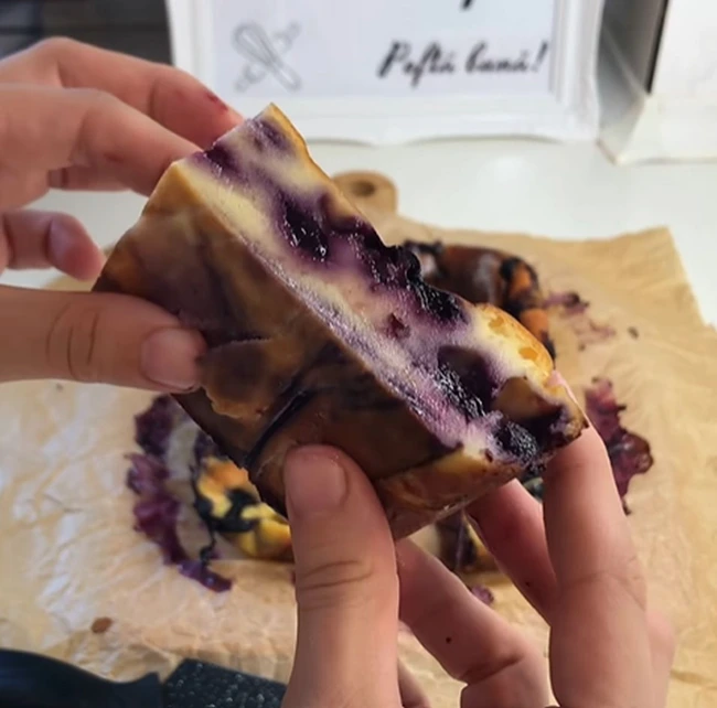 - La final, adaugă afinele și amestecă ușor pentru a le distribui uniform în compoziție.