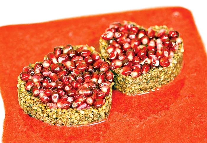 Mod de preparare: toate ingredientele, mai puţin rodia, se amestecă într-un bol. Compoziţia se pune în forme culinare (inimioare) şi se presează cu o lingură. Se ornează cu bobiţe de rodie. Glazura se realizează amestecând într-un blender toate ingredientele, apoi se toarnă pe lângă cele două inimioare, transformându-le în două “insule de dragoste”.