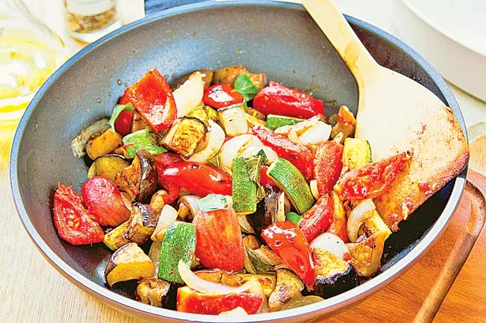 Preparare: Legumele se taie cubuleţe sau julien, se trag în ulei de măsline, se adaugă sarea, busuiocul şi sosul de roşii. Totul se ţine pe foc 5 minute.