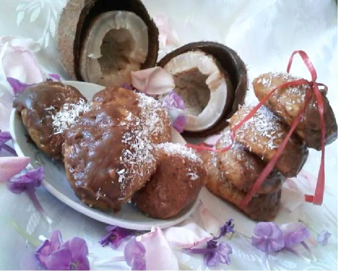 Ingrediente: 40 g unt, 200 g zahăr, făină, laptele de la o nucă de cocos, un ou, o linguriţă bicarbonat, un praf de sare, sirop, 2 linguri unt, o lingură finetti, 1 lingură zahăr pudră; Pentru decor: ciocolată şi nucă de cocos. Amestecăm zahărul cu untul şi oul. Mixăm bine şi adăugăm bicarbonatul dizolvat în laptele de cocos. Amestecăm şi treptat adăugăm făină până devine o compoziţie uşor de modelat. Dăm aluatul 30 minute la frigider. Pregătim o tavă tapetată cu hârtie de copt. Scoatem aluatul şi rupem bucăţele şi formăm biluţe pe care le modelăm. Le aşezăm în tavă cu distanţă între ele de circa un cm şi le dăm la cuptor. Între timp topim untul cu lingura de finetti şi zahărul până se formează o cremă ca o smântână. Scoatem biscuiţii fierbinţi din tavă şi îi dăm prin sirop. Răzuim puţină nucă de cocos peste biscuiţii fierbinţi. După ce se răcesc, băgăm cealaltă jumătate de biscuite prin ciocolata topită. (Gabriela Antici)