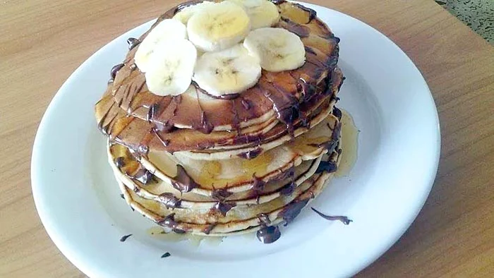 Ingrediente: 3 ouă, 150 g făină, 1 linguriţă praf de copt, 140 ml lapte, un vârf de sare; Separaţi albuşurile de gălbenuşuri. Adăugaţi făina, praful de copt şi laptele peste gălbenuşuri şi mixaţi până obţineţi un aluat nu tocmai subţire.Mixaţi albuşurile împreună cu vârful de sare până sunt ferme şi adăugaţi amestecând uşor, de jos în sus, în aluatul cu gălbenuşuri. Prăjiţi câte o clătită pe rând în tigaia încinsă, unsă cu unt, pe fiecare parte până se rumeneşte. Puneţi o lingură sau două de aluat, în funcţie de mărimea dorită, în mijlocul tigăii. Le umpleţi cu miere, finetti şi banane. (Andra Nagy)