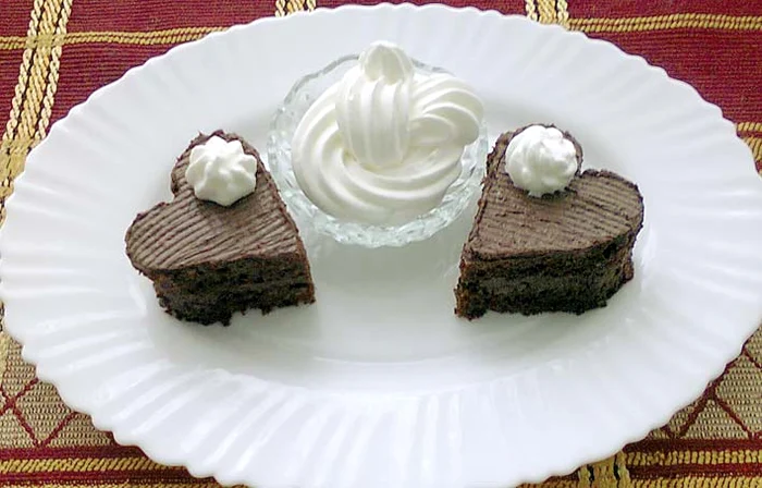 Blat: 6 ouă, 200 g zahăr tos, o lingură cafea, o lingură apă rece, 25 g cacao, 200 g făina, un plic praf de copt. Gălbenuşurile se freacă cu zahărul, apoi se adaugă cafeaua şi apa. Albuşurile cu un praf de sare se bat spumă şi se adaugă peste gălbenuşuri. Făina se cerne cu cacao şi praf de copt şi se încorporează în compoziţia de ouă. Blatul se pune în tava tapetată cu hârtie de copt şi se coace în cuptorul încălzit. Când se răceşte se taie în două şi se însiropează cu lapte rece amestecat cu rom. Crema: 250 g margarină , 400 g ciocolată, 25 g cacao, esenţa de rom. Se freacă margarina cu cacao, apoi se adaugă ciocolata topită şi răcită şi esenţa de rom. După ce s-a tăiat blatul se pune prima foaie însiropată în tavă, se întinde crema, se pune a doua foaie şi iar crema. Se lasă la rece pentru o oră, apoi se taie inimioarele şi se ornează cu frişcă. (Ermina Vlăsceanu)