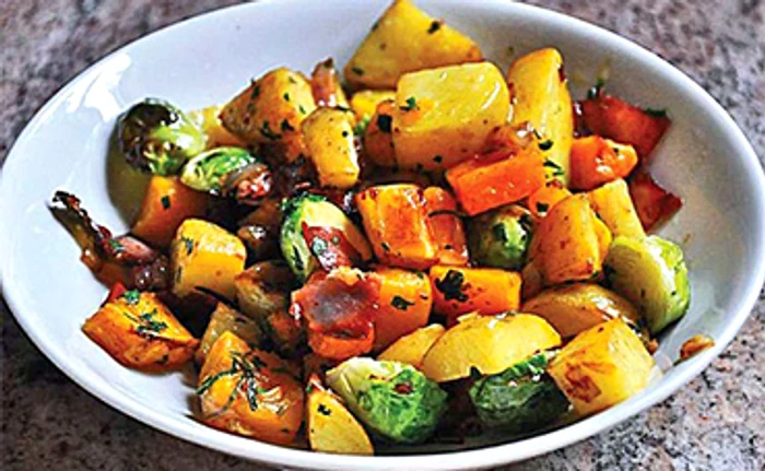 Ingrediente: 4-5 cartofi, 2 ardei graşi, o conopidă mică, 400 g fasole, 5 roşii, 4 morcovi, 2 dovlecei, o varză mică, 2 vinete potrivite, o ţelină mică, 3, 4 cepe, 300 ml suc de roşii, 2-3 legături de pătrunjel, sare, piper.