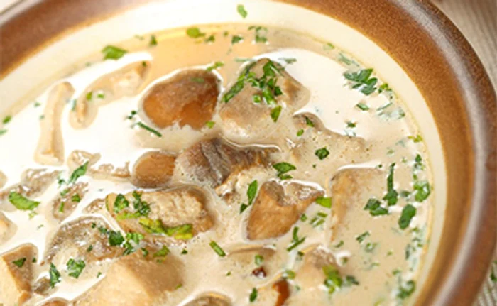 Preparare: Se curăţă ceapa, se taie mărunt şi se căleşte până se înmoaie. Se adaugă ciupercile curăţate, spălate şi tăiate felii subţiri şi se călesc până scade zeama lăsată. Separat, se dizolvă făina cu puţină apă rece, apoi se toarnă peste ciuperci. Se mai completează cu apă caldă, se condimentează cu sare şi piper şi se lasă la fiert până se îngroaşă sosul. În momentul servirii poţi adăuga smântână. Se serveşte cu mămăligă caldă.