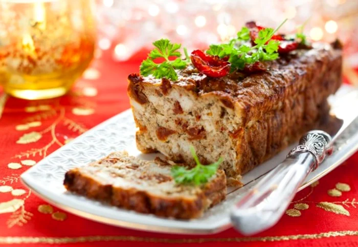 750 g carne de pui tocată3 felii pâine100 ml lapte300 g piept de pui100 g roşii uscate la conservă1 ceapă mare4 ouă2 căţei usturoi1 linguriţă rozmarin uscat50 g untsarepiperfăină pentru tapetat tavapătrunjel verde pentru decor