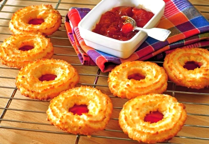 200 g unt moale1 gălbenuş200 g făină5 linguri zahăr100 g nucă de cocos1 lingură oţet4 linguri apă minerală1 esenţă de vanilie1 praf de saregem