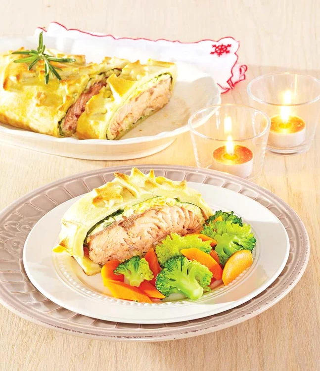 Ingrediente: 4 fileuri de somon, 1 foaie de aluat, foitaj, 250 g spanac congelat, 400 g perle de brânză cu smântână, sare, zeamă de lămâie, 1 ceapă, 1 căţel usturoi, ulei, 1 ou, pentru uns, fire de rozmarin, pentru décor, legume preparate la aburi.