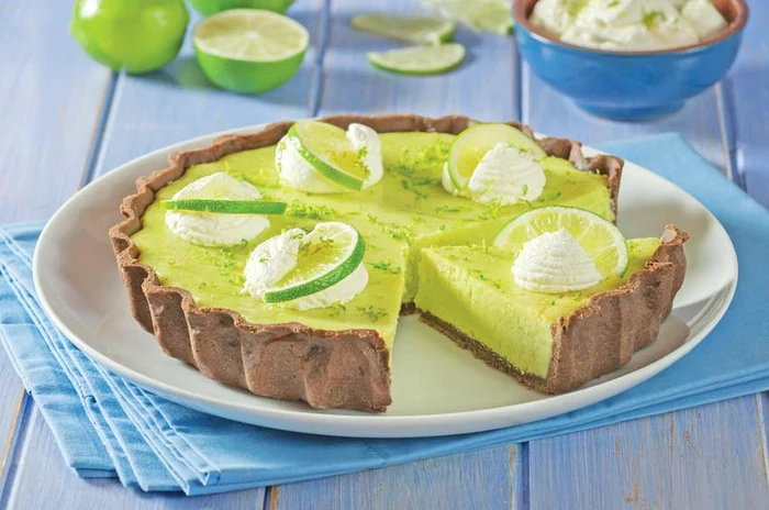 Ingrediente: Pentru blat: 200 g făină, 50 g cacao pudră, 125 g unt, 1 ou, 150 g zahăr; Pentru umplutură: 400 ml smântână pentru frişcă, 2 avocado bine coapte, coaja răzuită de la 2 lime bio, 2 ouă, 4 linguri făină, 100 g zahăr; Pentru decor: 200 ml smântână lichidă, 50 g zahăr, 1 lime.